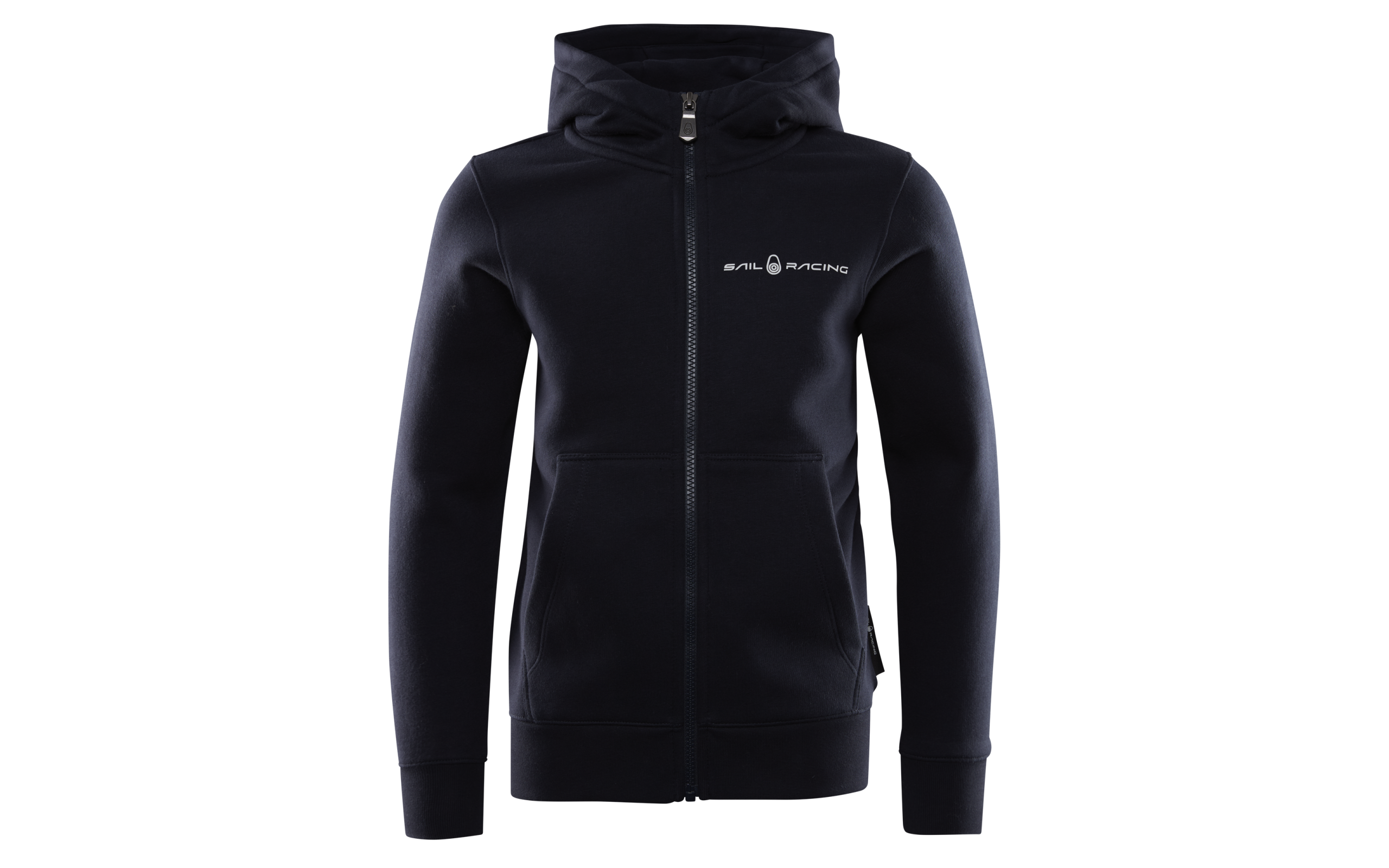 The Jr Bowman Logo Zip Hood is a classic zip hoodie made from a premium blend of cotton and polyester, featuring a soft, brushed tricot on the inside for added comfort. The hoodie has ribbed cuffs and a ribbed bottom hem for a customized fit, along with an adjustable hood with drawstrings. Spacious, open waist pockets provide convenient storage. Designed with a printed Sail Racing logo on the chest and a printed block logo on the top of the hood.