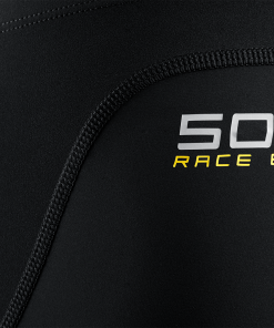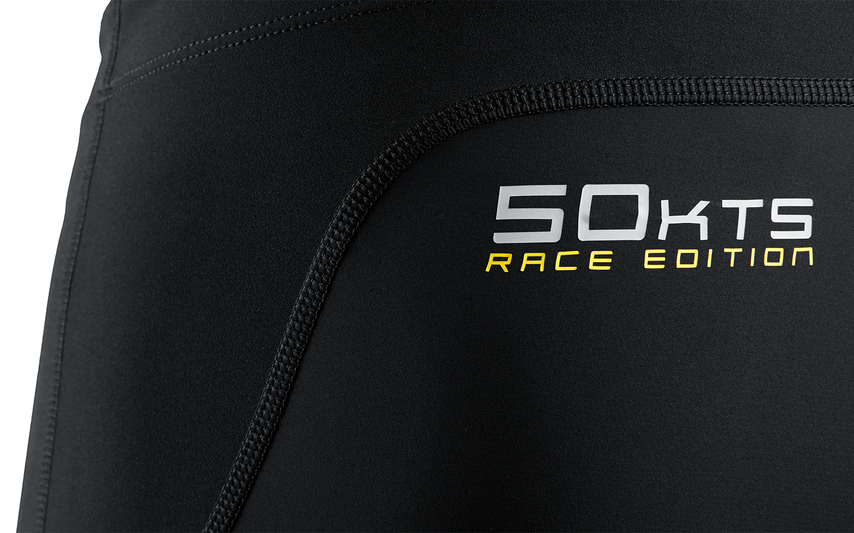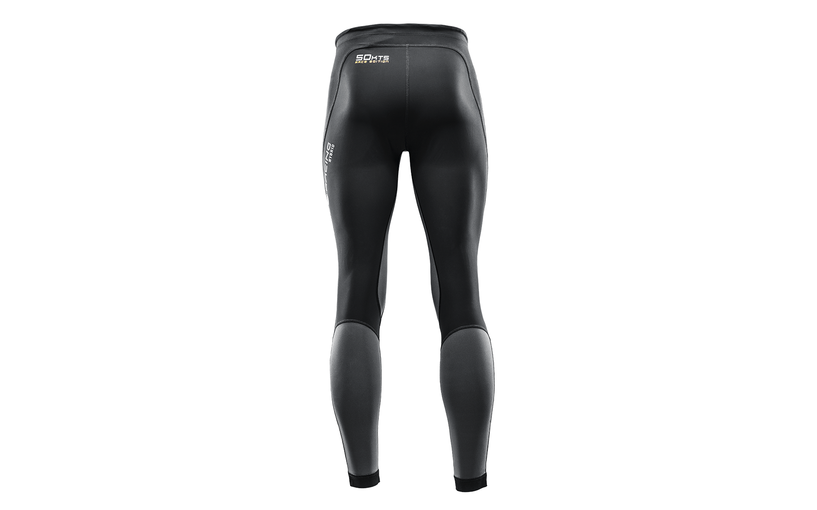 The waist can be adjusted with a drawstring and is reinforced on the inside with anti-glide tape for a customized and secure fit. The leg cuffs are also equipped with anti-glide tape on the back of the ankle to prevent the leggings from riding up the leg. The leggings have a convenient, small pocket just below the waist on the left leg for easy access to tools. They are designed with a Sail Racing logo on the right leg and a 50KTS logo on the back, just below the waist on the left side.