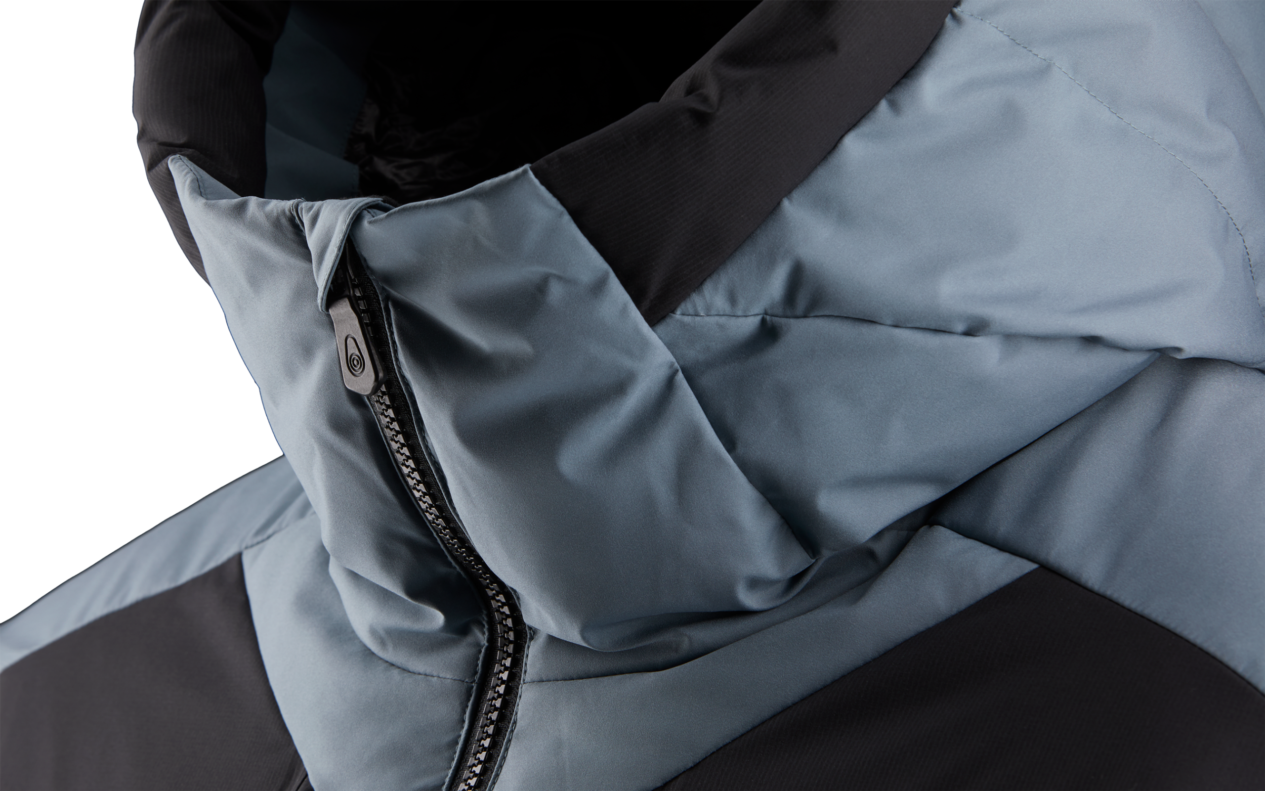 The outer shell is treated with a PFC-free DWR coating, providing water-repellent properties that promote water runoff and help keep the fabric dry. To ensure warmth and comfort in cold weather conditions, the jacket is insulated with 70/30 bluesign® APPROVED and RDS-certified down and feathers, offering a fill power of 500.