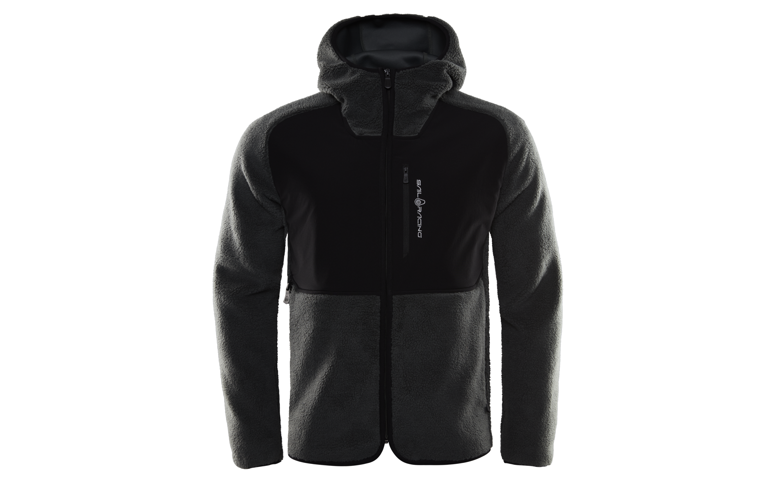 The pile jacket is designed with a Sail Racing logo on the chest pocket.