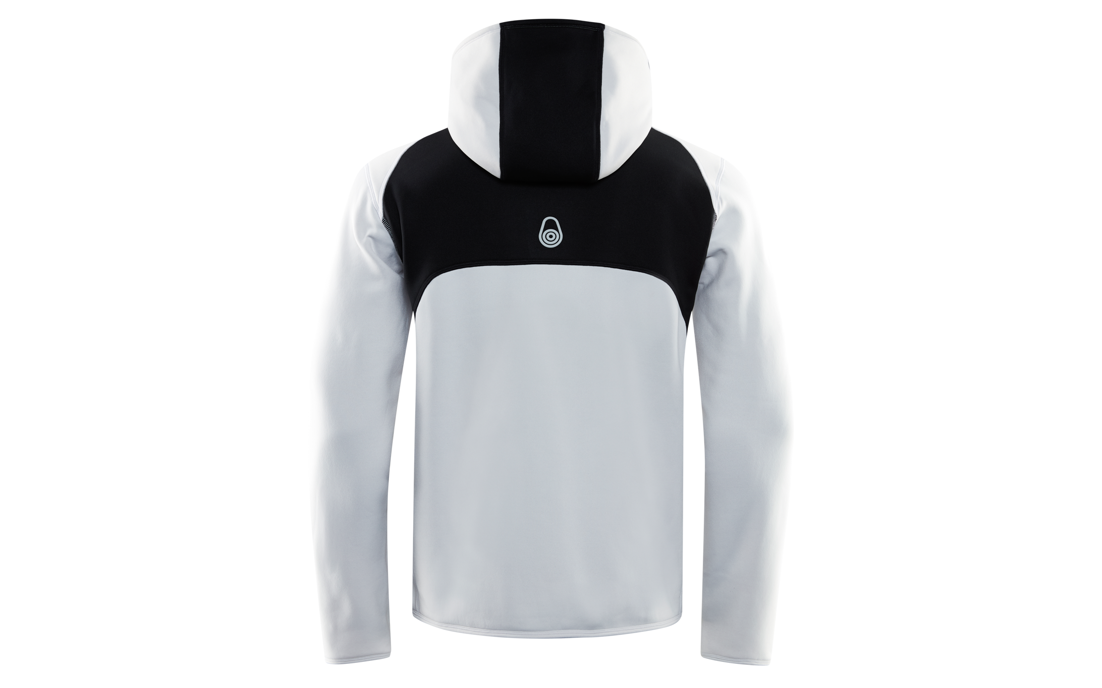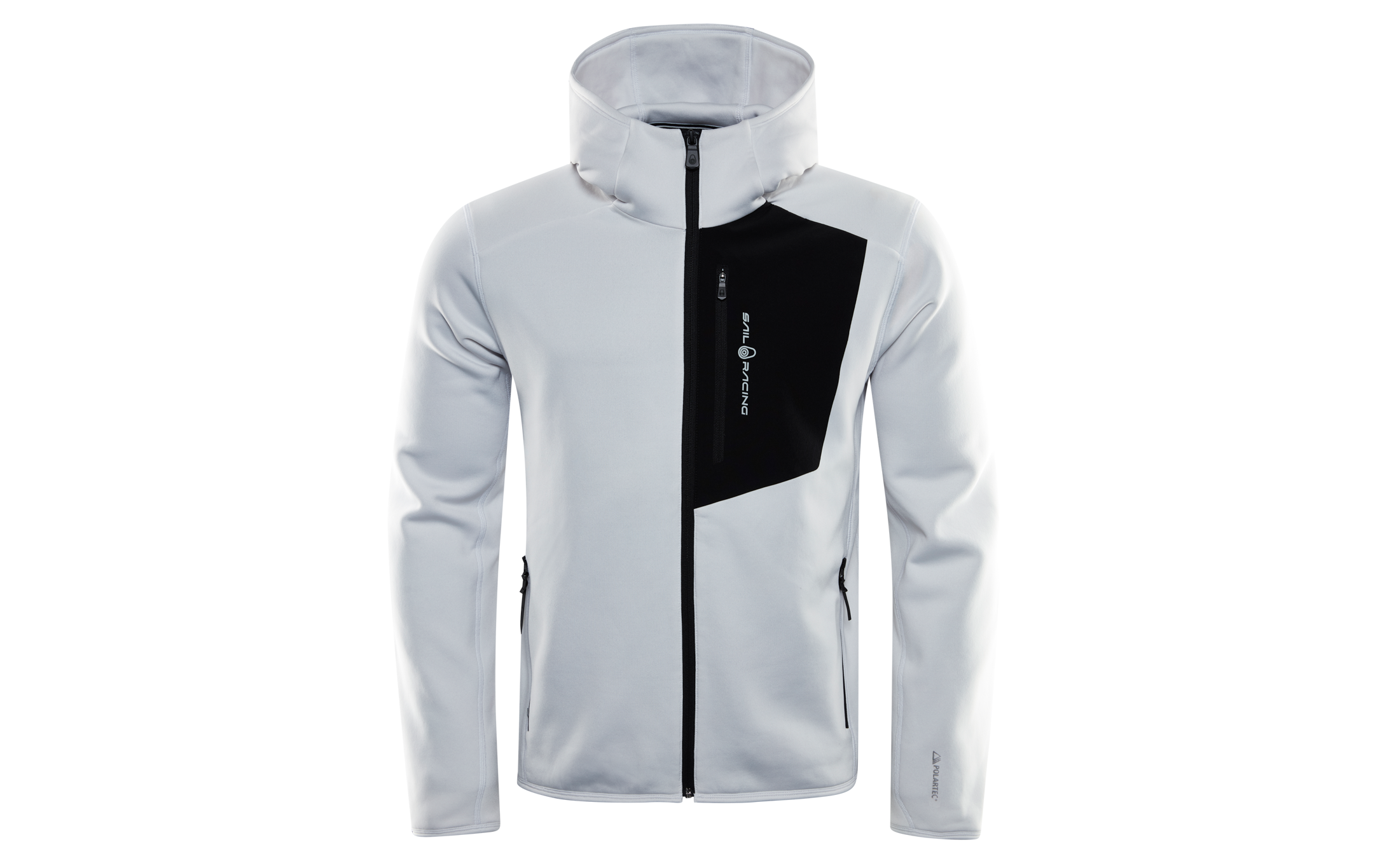 The jacket is crafted with a high collar and hood that provides protection against wind intrusion. For practical storage options, the fleece jacket is equipped with two zippered waist pockets and a spacious chest pocket. The design features a Sail Racing logo printed vertically along the chest pocket zipper and a Polartec® logo printed on the left cuff, along with a Sail Racing bloc logo on the upper back.