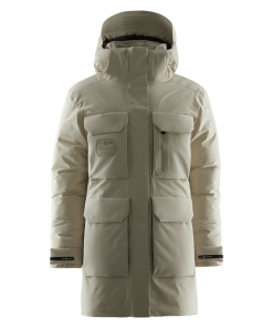 The coat has a two-way water-repellent SHZ® zipper for ventilation options and freedom of movement. It also has button closure extending all the way down to the bottom hem of the parka. The cuffs are asymmetrically shaped with a longer finish at the front of the hands for extra protection against cold, and they feature an elastic cuff on the inside to prevent wind and water infiltration. The down coat is equipped with two spacious waist pockets with water-repellent SHZ® zippers and three inner pockets, one of which has a zipper for secure storage. Additionally, there are two practical mesh pockets with elastic closure. The jacket is designed with a molded block logo on the top of the hood.
